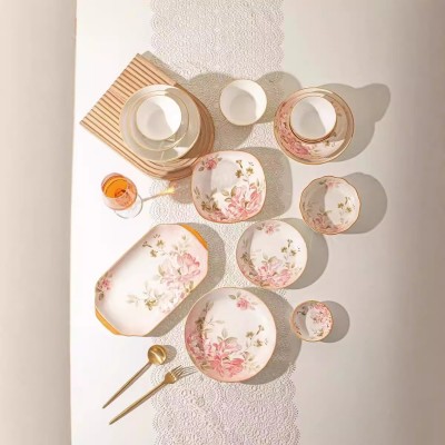 御宝坊 陶瓷饭碗花瓣碗盘家用红花餐具盘子乔迁日用餐具套装